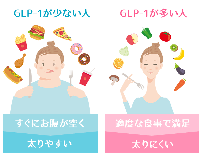 GLP-1は私たちの体の中にもともとあるホルモンで、「満腹感を持続させる作用」があり、太りにくい体質の人はGLP-1の分泌量が多いと言われています。